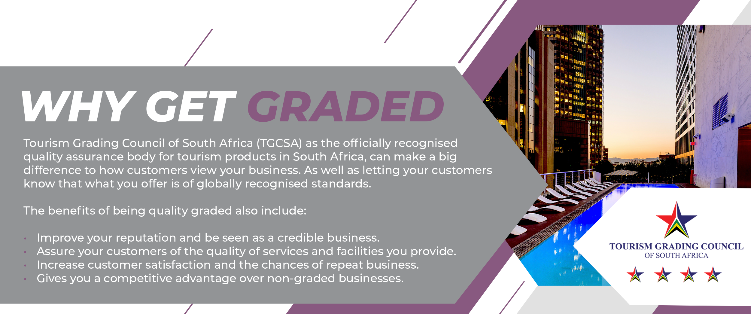 Grading is done against criteria as set out by the Tourism Grading Council of South Africa and star rating is awarded by the Executive Board of the TGCSA.